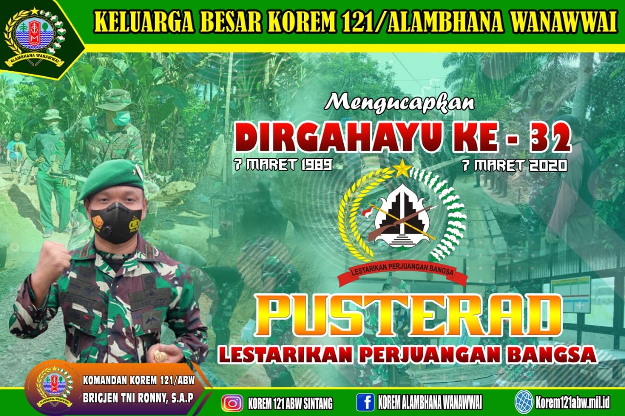 KELUARGA BESAR KOREM 121/ALAMBHANA WANWWAI MENGUCAPKAN DIRGAHAYU KE -32 PUSAT TERITORIAL ANGKATAN DARAT “LESTARIKAN PERJUANGAN BANGSA” 7 Maret 2021 oleh Redaksi Korem 121/abw