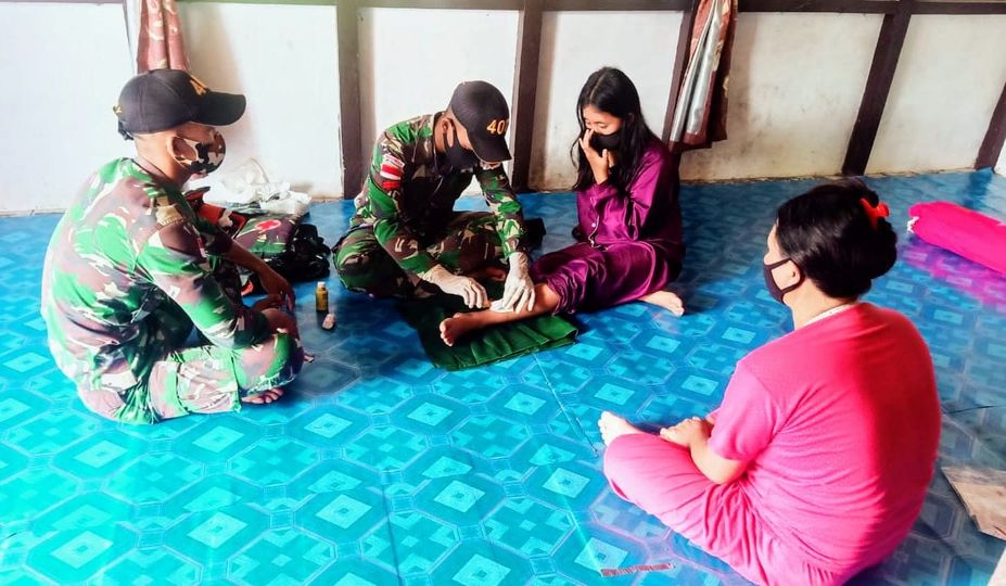 Tim Kesehatan Pos Sei Kelik Satgas Yonif 407/PK memberikan pertolongan pertama kepada Jelli Ridwan (16) warga Ds. Sungai Kelik, Kec. Ketungau Hulu, Kab. Sintang, yang mengalami luka terkena pecahan kaca Lemari saat membersihkan rumah. Senin (08/03/2021).