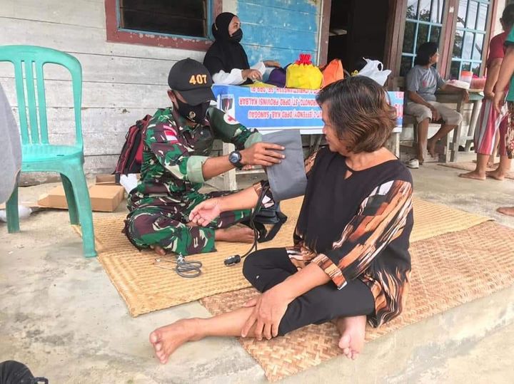 Prajurit Satgas Pamtas RI-MLY Yonif 407/PK anggota Pos Sei Tekam melakukan kegiatan bakti sosial pelayanan kesehatan dan pengobatan gratis kepada warga di Desa Sei Tekam, Kec. Sekayam, Kab. Sanggau, Kalimantan Barat. Sabtu (13/03/21).