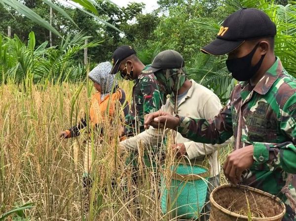 Selalu hadir di tengah-tengah kehidupan masyarakat binaan. Satgas Pamtas Yonif 407/PK membantu warga mengani (memanen padi) milik warga Desa Seria, Kecamatan Ketungau Hulu, Kabupaten Sintang, Kalbar. Senin (15/03/2021)