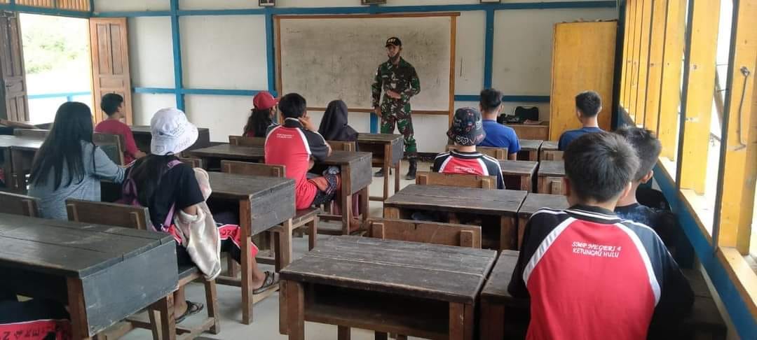 Guna memberikan semangat dan motivasi juang kepada siswa – siswi untuk lebih giat dalam belajar, Satgas Pamtas Yonif 407/Padma Kusuma membantu menjadi tenaga pendidik (Gadik) di SMP N 4 Ketungau Hulu Desa Nanga Bayan, Kecamatan Ketungau Hulu, Kab.Sintang, Kalbar. Senin (22/03/21).
