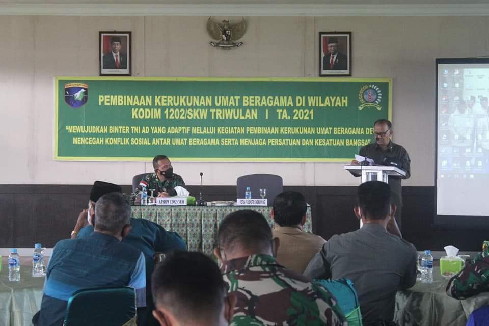 Dalam sambutannya Dandim 1202/Skw Letkol Inf Condro Edi Wibowo, S.Sos., M.Han, melalui Kasdim 1202/Skw Mayor Inf Suharmoko menyampaikan bahwa tujuan diselenggarakan kegiatan ini agar prajurit TNI, Keluarga Besar TNI (KBT), Tokoh Agama dan Tokoh Pemuda benar- benar memahami tentang arti toleransi umat beragama di mana antar umat beragama dapat saling menerima, saling menghargai dan saling menghormati keyakinan masing-masing, saling tolong-menolong dan bekerjasama dengan perbedaan keyakinan agama yang ada, ucapnya.
