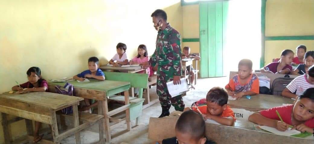 Satuan Tugas Pengaman Perbatasan RI-MLY Yonif 407/PK Sektor Timur Kalimantan Barat, Pos Riam Sejawak menjadi Tenaga Pendidik (Gadik) disekolah SDN 25 Primpah, Dusun Sei Beruang, Desa Sei Tekam, Kec. Sekayam, Kab. Sanggau, Kalbar. Kamis (25/03/21).