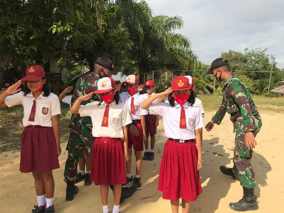 Satgas Pamtas RI-MLY Yonif 407/PK Pos Muakan melatihkan tata cara Peraturan Baris Berbaris (PBB) yang baik dan benar kepada Siswa – siswi SDN 08 Muakan, Dusun Muakan Hulu, Desa Muakan Petinggi , Kecamatan Ketungau Hulu, Kabupaten Sintang, Kalimantan Barat. Senin (29/03/21).