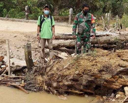 Bengkayang – Babinsa Koramil 1202-06/Samalantan Koptu Dirus tinjau lokasi Jembatan penghubung antara Goaboma menuju Singkawang yang ambruk akibat banjir di Dsa Rantau, Kecamatan Monterado, Kabupaten Bengkayang, Kamis (31/3/21).