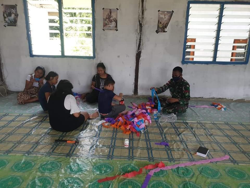 Anggota Pos Sei Mawang I Satgas Pamtas Yonif 407/PK membantu warga mendekorasi Gereja ST. Siklus Menjelang Hari Suci Paskah umat Kristiani di Desa Sungai Mawang, Kec. Puring Kencana, Kab. Kapuas Hulu, Prof. Kalimantan Barat. kemaren Kamis (01/04/2021).