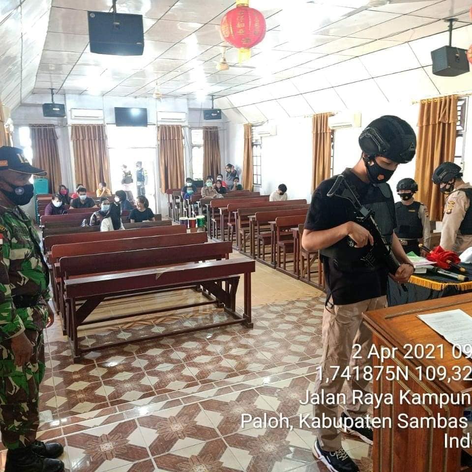 Sambas – Salah satunya saat pengamanan pelaksanaan ibadah Jumat Agung di Gereja GKE, Dsn. Perintis, Desa Nibung, Kec. Paloh, Kab. Sambas, Jumat (2/4/2021).