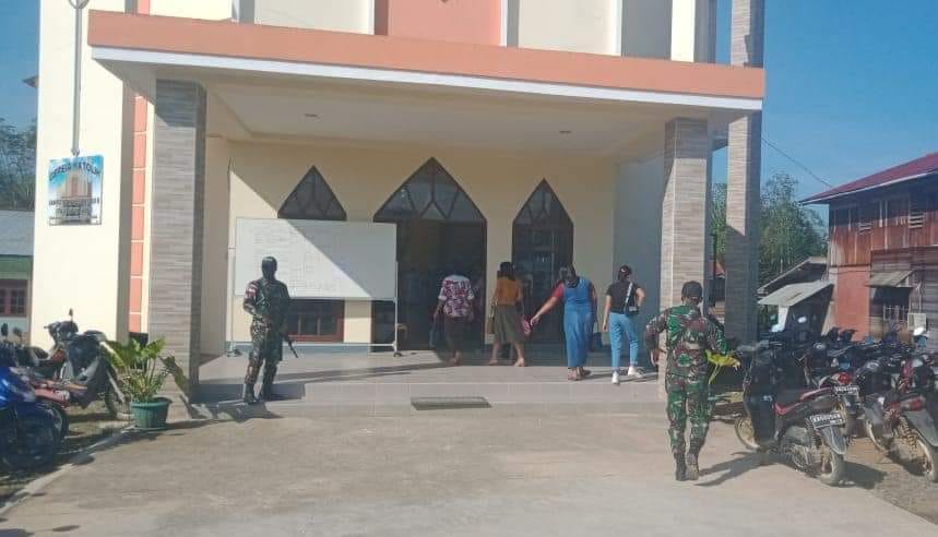 Sanggau, Kalbar – Personel Satgas Pamtas RI-MLY Yonif 642/Kps melaksanakan kegiatan pengamanan ibadah Paskah umat Kristiani yang di selenggarakan di Gereja Santo Paulus, Desa Lubuk Sabuk, Kecamatan Sekayam, Kabupaten Sanggau,Kalbar.