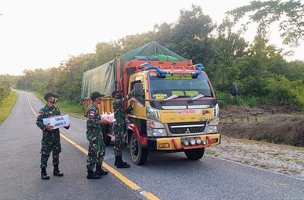 Di bulan Suci Ramadhan yang penuh berkah ini, Satgas Pamtas Yonif 407/PK yang bertugas di perbatasan RI-MLY membagikan takjil gratis untuk berbuka puasa kepada masyarakat yang melintas dijalan yang berada didepan Pos Kapar wilayah Dusun Kapar, Desa Senunuk, Kec. Batang Lupar, Kab. Kapuas Hulu, Kalimantan Barat. Rabu (21/04/2021).