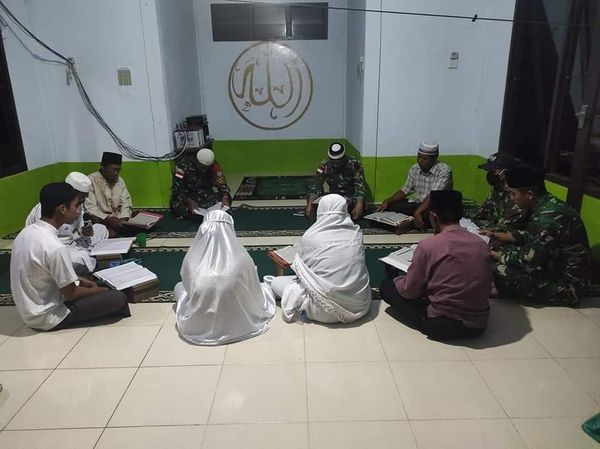 Sambas, Kalbar – Satgas Pamtas RI-Malaysia Yonif 642/Kps, Pos Sei Tengah, membaur bersama masyarakat melaksanakan tadarus Al Qur’an bersama selepas ibadah Tarawih di masjid Nurul Iman, Dusun Sebubus, Kecamatan Paloh, Kabupaten Sambas, Kalimantan Barat, Kamis (29/04/2021) malam.