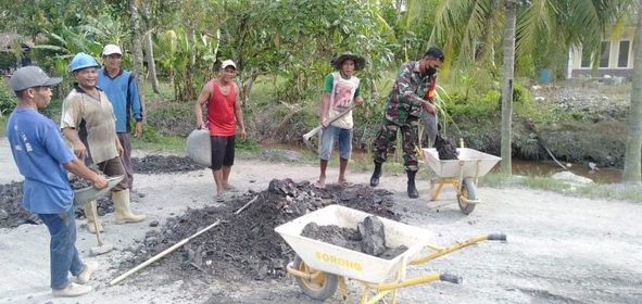 Sambas, pada hari Sabtu Tanggal (01- 5 -2021) Babinsa 1208-03/ Tebas Sertu Agus My melaksanakan kegiatan gotong royong di Dsn Rimbun Rt10/Rw05 Dsn Serindang, Kec. Tebas, Kab. Sambas bersama warga melaksanakan karya bakti penimbunan jalan menggunakan tanah kong.