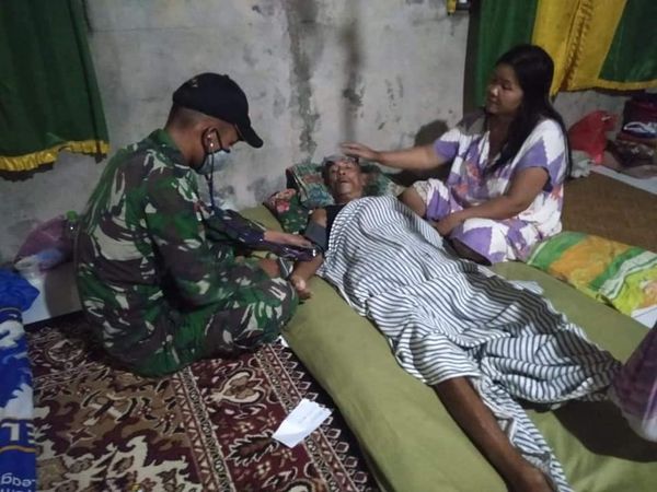 Satgas Pamtas Yonif 407/PK memberikan pelayanan kesehatan kepada warga Dusun Seriang Hilir, Desa Seriang, Kec. Badau, Kab. Kapuas Hulu, Kalimantan Barat, untuk membantu memeriksa kondisi kesehatan warga yang mengalami struk ringan. Rabu (05/04/2021).
