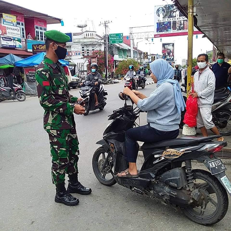 Penyampaian Danramil 1208-01/Sambas Kapten Inf Sulistiono saat ditemui ditempat kerjanya, himbauan protokol kesehatan yang disampaikan kepada warga harus dengan cara humanis agar warga menerima, mengerti dan melaksanakan protokol kesehatan dalam kehidupan sehari-hari, disiplin menjaga jarak dalam beraktivitas/kerja (phisical distancing), pungkasnya