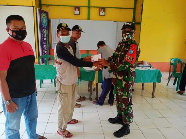 Sambas, Kalbar – Satgas Pamtas RI-Malaysia Yonif 642/Kps, Pos Camar Bulan membantu kegiatan Pemberian Tunjangan kepada Para Abdi Desa Temajuk di Gedung Serba Guna Desa Temajuk, Kecamatan Paloh, Kabupaten Sambas.