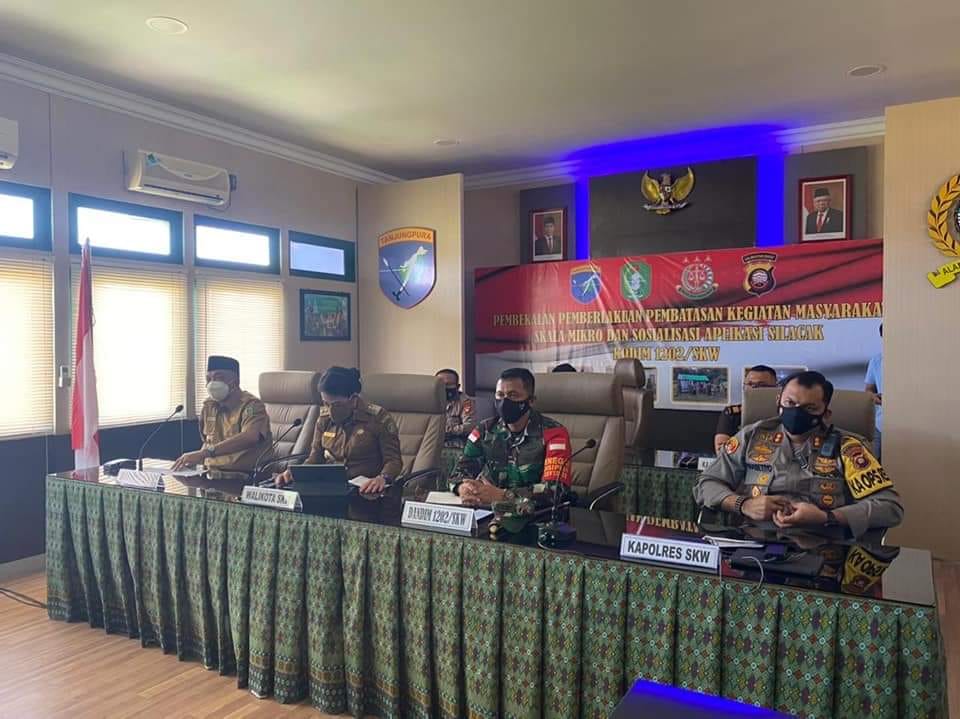 Singkawang, Senin (10/5/21) Dandim 1202/Skw Letkol Inf Condro Edi Wibowo, S.Sos., M.Han bersama Forkopimda Wilayah Singkawang dan Bengkayang ikuti pembekalan PPKM Skala Mikro dan Sosialisasi Aplikasi Silacak.