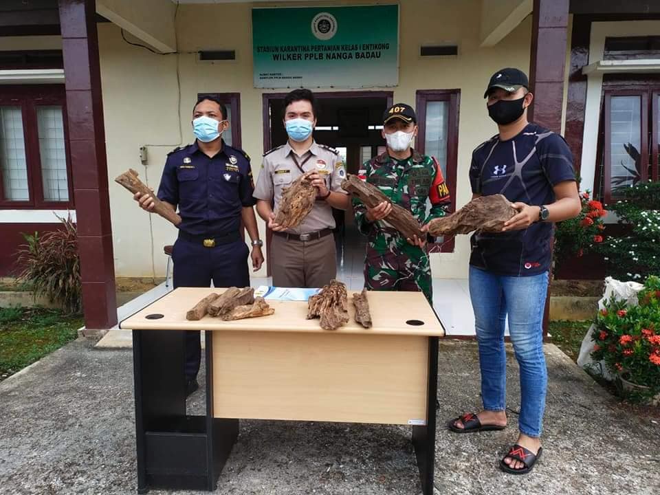 Satgas Pamtas RI-Malaysia Yonif 407/PK kembali menyerahkan barang bukti berupa satu karung kayu gaharu mentah seberat 13,5 Kg dan gaharu kepada Stasiun Karantina Pertanian Kelas I Entikong Wilker Nanga Badau bertempat di Kantor Stasiun Karantina Pertanian Kelas I Entikong Wilker PPLB Nanga Badau, Kecamatan Badau, Kabupaten Kapuas Hulu, Kalbar.