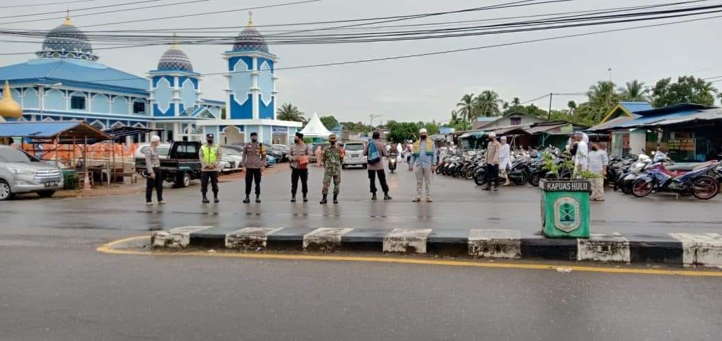 Putussibau – personil gabungan TNI polri bersinergi bersama melaksanakan kegiatan pengamanan jalannya ibadah sholat Idul Fitri di masjid Agung Darusallam, Kamis (13/05/2021)