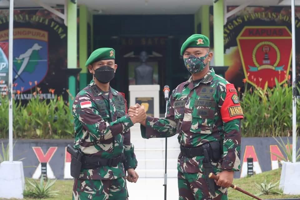 Sanggau, Kalbar – Prajurit Yonif 642/Kps yang tergabung dalam Satgas Pamtas RI-MLY melaksanakan serah terima tugas sebagai pasukan penjaga wilayah perbatasan RI-MLY sektor barat dengan Satgas Pamtas Yonif Mekanis 643/Wns di Mako Satgas Entikong, Kabupaten Sanggau, Kamis (20/05/2021).