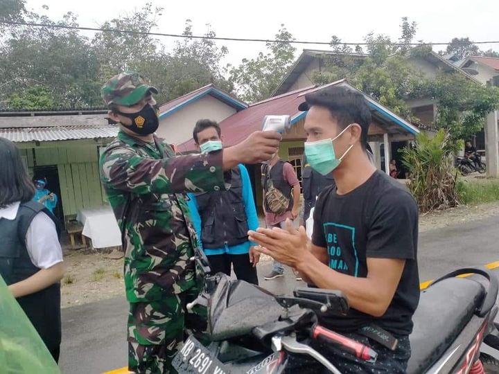 “Dimasa pandemi covid- 19, kami menghimbau kepada warga masyarakat agar menerapkan protokol kesehatan dengan mengenakan masker saat beraktifitas, menjaga jarak sosial, rajin mencuci tangan dan jika tidak ada kepentingan yang mendesak tetap berada dirumah saja”. Himbau Serda Tomi