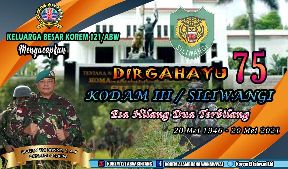 KELUARGA BESAR KOREM 121/ABW MENGUCAPKAN DIRGAHAYU KODAM III/SILIWANGI KE-75 “ESA HILANG DUA TERBILANG” 21 Mei 2021 oleh Redaksi Korem 121/abw KELUARGA BESAR KOREM 121/ABW MENGUCAPKAN DIRGAHAYU KODAM III/SILIWANGI KE-75 “ESA HILANG DUA TERBILANG”