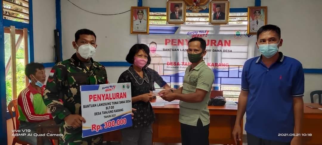 Putussibau – Guna memantau dan memastikan penyaluran Bantuan Langsung Tunai (BLT) tepat sasaran kepada masyarakat yang berhak menerima, Babinsa Koramil 1206-06/Putussibau Utara bersama Bhabinkamtibmas mendampingi penyaluran BLT di Desa Tanjung Karang, Kecamatan Putussibau Utara, Kabupaten Kapuas Hulu, Sabtu (22/05/2021).