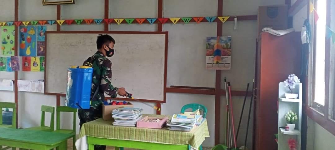 SINTANG – Babinsa Koramil 1205-09/Meraki Serda Yandi, mensterilkan lingkungan guna mencegah penyebaran Covid-19, di lingkungan TK Tunas Harapan, Desa Wirayuda, Kecamatan Ket. Tengah, Kabupaten Sintang, Minggu (23/05/2021)