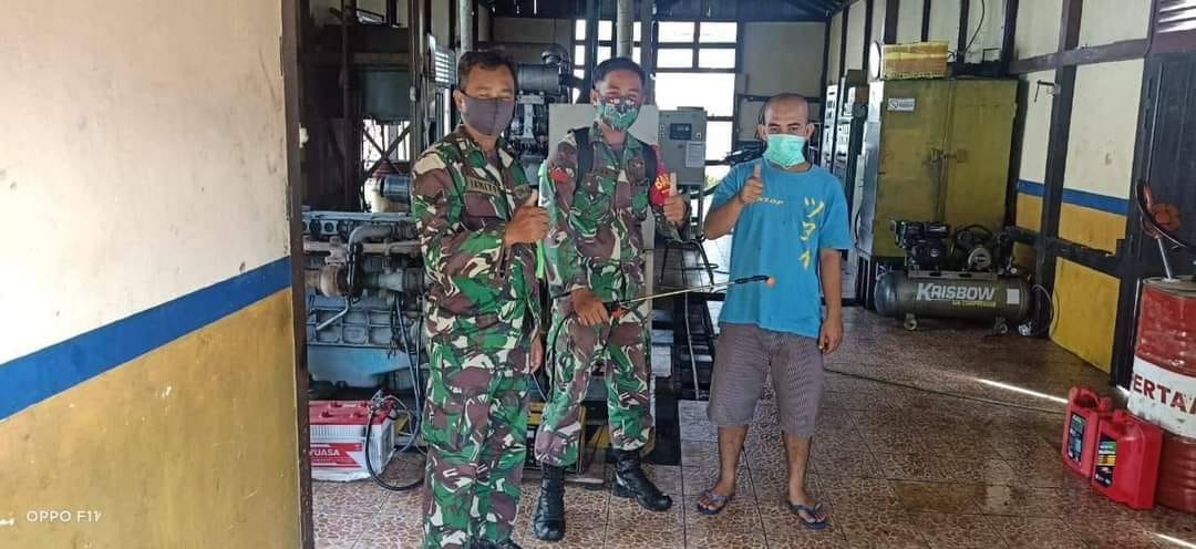 Babinsa Praka Saga bersama Masnyarakat, bersemangat bergotong royong membersihkan rumput liar didepan halaman Kantor dan memalkukan penyemprotan di mesin PLN Nanga Silat