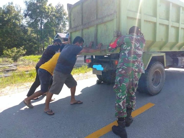 Sambas – Babinsa Koramil 02/Sejangkung Kodim 1208/Sambas Koptu Hakim Ismail terlihat mendorong kendaraan truk warga desa binaanya yang mogok di tengah Jalan, Selasa (25/05/2021).