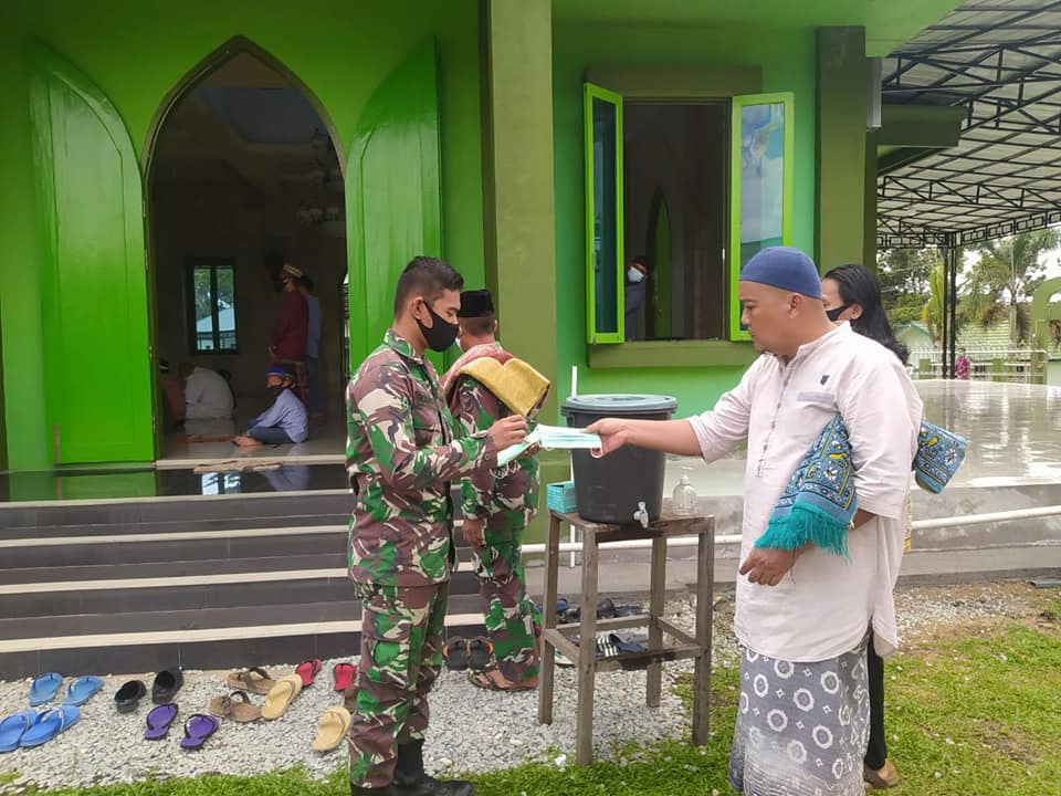 Sintang. Prajurit Korem 121/Abw membagikan masker di sekitaran masjid Darul Muttaqin, Jalan Pangeran Kuning, Kelurahan. Tanjungpuri, Kecamatan. Sintang, Kabupaten. Sintang, Jumat(28/5/2021). Hal tersebut dilakukan dalam rangka memutus rantai penyebaran Covid-19 yang masih tinggi di Wilayah Sintang ini.