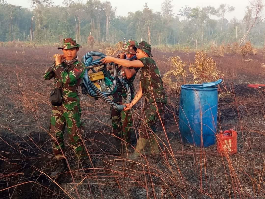 Tampak dengan jelas anggota Koramil 04/ Sungai Kunyit tergabung dalam penanggulangan karhutla, berjibaku mengerahkan segala kemampuan untuk memadamkan titik api di hutan gambut.