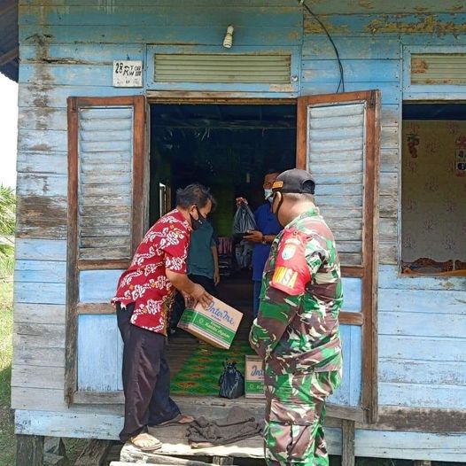 Sambas – Babinsa Salatiga Prajurit Kepala Imam Riyadi bersama perangkat Desa Salatiga melaksanakan kegiatan penyaluran bantuan sembako terhadap warga Desa Salatiga yang terkonfirmasi covid-19 dan sedang melaksanakan isolasi mandiri, di Dusun Selindung Rt/Rw 08/03, Desa Salatiga, Kec. Salatiga, Kab. Sambas, Sabtu (31/7)