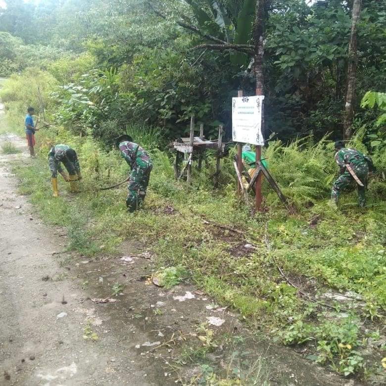 Mensiau,- Anggota satgas pamtas RI-malaysia Yonif 144/JY Karya Bhakti Bersama Masyarakat membersihkan jalan di desa Mensiau Kecamatan Batang Lupar Kabupaten Kapuas Hulu Kalbar.