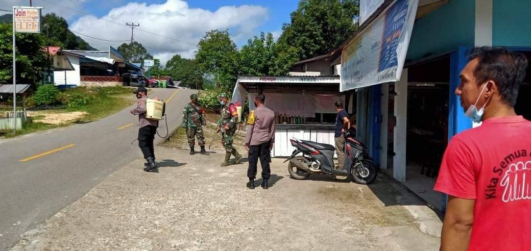 Kapaus Hulu – Koramil 1206-09/Jongkong bersama satgas Covid 19 Desa Sira melaksanakan penyemprotan desinvektan di Simpang Mawan Pengkadan -Jongkong Desa Sira Jaya Kecamatan Pengkadan Kabupaten Kapuas Hulu, Jum’at, (06/08/2021).