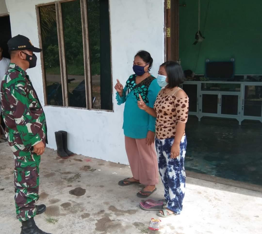 Landak – Babinsa 06/Menjalin, Kodim 1201/Mempawah, Serda Sapardi membesuk dan memberi perhatian terhadap warganya yang sedang Isolasi Mandiri (Isoman) di Desa Nangka, Kecamatan Menjalin Kabupaten Landak, Selasa(10/8/2021).