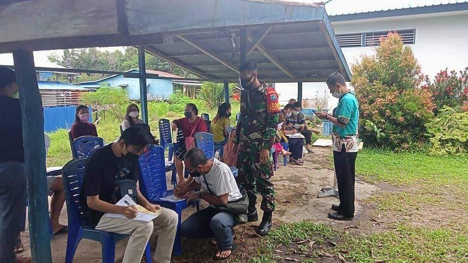 Kapuas Hulu – Dalam rangka memutus rantai covid-19 Babinsa Koramil 1206-02/Semitau Praka Alexander, Kodim 1206/PSB memantau pelaksanaan Vaksinasi bertempat di Puskesmas Semitau, Kecamatan Semitau, Kabupaten Kapuas Hulu. Kamis, (19/08/2021).