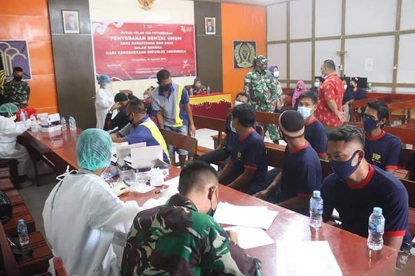 Kapuas Hulu – Kodim 1206/PSB laksanakan tes Swab Antigen kepada penghuni rutan Putussibau. Kegiatan ini terlaksana atas permintaan kepala rutan Putussibau Bapak Rio Mulyadi Sitorus Amd, IP, S.H, M.H kepada Danramil 1206-06/Putussibau Utara Kapten Inf Nanang Sundari. Kegiatan tes Swab ini dilaksanakan di Aula Rutan Putussibau, Desa Kedamin Hulu, Kecamatan Putussibau Selatan, Kabupaten Kapuas Hulu. Jum’at, (20/08/2021).