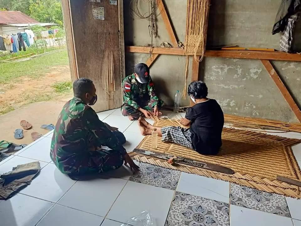 Sungai Senunuk,-Anggota Satgas Pamtas RI-Malaysia Yonif 144/JY melaksanakan Binter bersama warga membuat menganyam tikar untuk menjemur padi di desa Sungai Senunuk Kecamatan Batang Lupar Kabupaten Kapuas Hulu Kalbar.