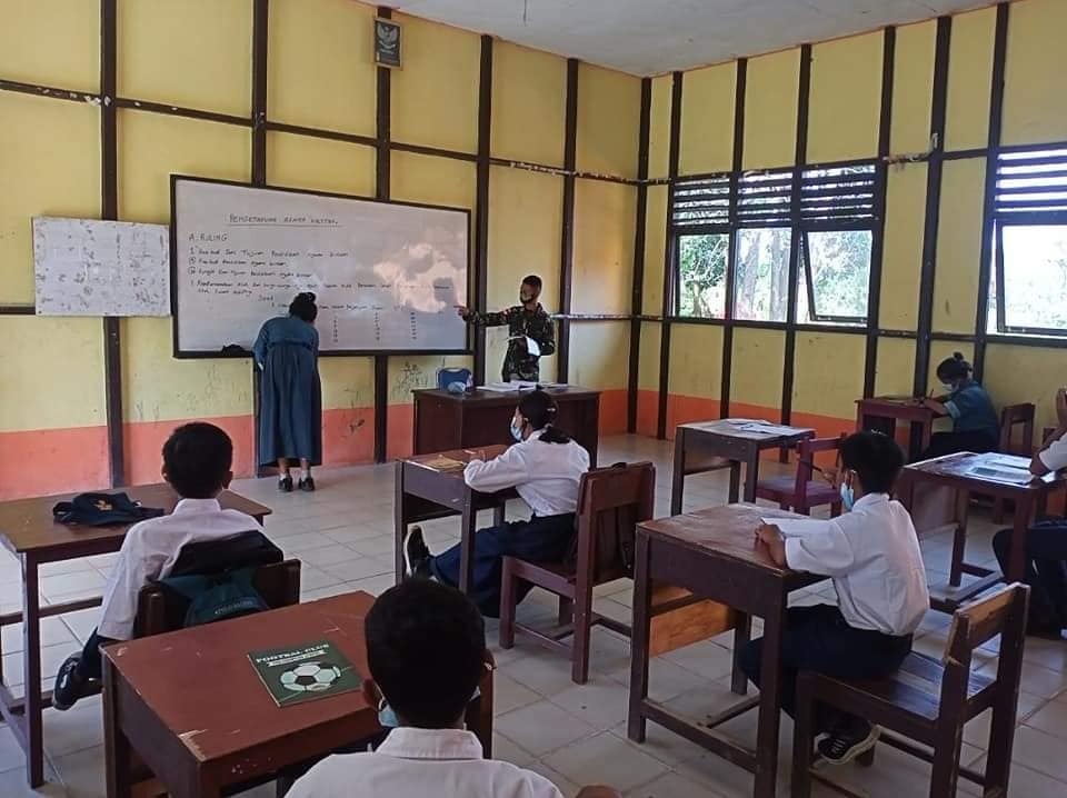 Sambas, Kalbar – Personel Satgas Pamtas Yonif Mekanis 643/WNS pos Sungai Tengah memberikan bantuan menjadi tenaga pendidik (Gadik) di SMPN 6 Satap Paloh Dsn.Sungai Tengah Ds. Sebubus Kec. Paloh Kab Sambas.