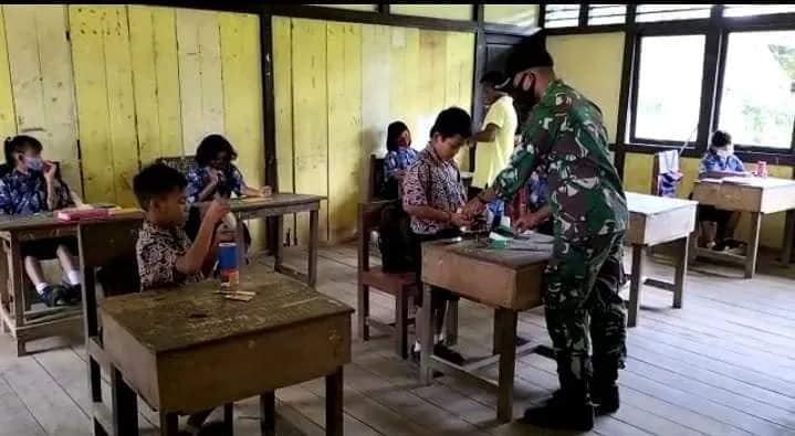 Selain menjadi Gadik Anggota Satgas mensosialisasikan prokes dan mencuci tangan sebelum kegiatan belajar mengajar agar terhindar dari Penyebaran Covid-19.(Pen Yonif 144/JY)