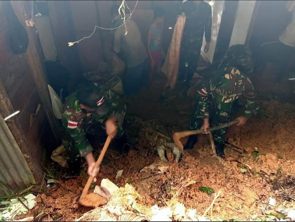 Dansatgas mengungkapkan, kegiatan kerja bakti bersama masyarakat ini dimulai dengan mengevakuasi barang-barang milik korban tertimpa longsoran. Dengan menggunakan alat sederhana seperti cangkul, sekop kami bahu membahu membersihkan reruntuhan material longsor, membuat saluran air, tidak ada korban jiwa dalam musibah longsor.