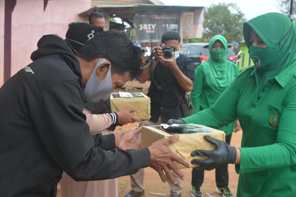 Kabupaten Kayong Utara, Ketua Persit KCK Koorcab Rem 121 Ibu dr.Rissa Ronny di dampingi pengurus Persit KCK Koorcab Rem 121, Ketua Persit KCK Cabang XLVII Kodim 1203 Ny. Suntara berserta Rombongan memberikan bantuan kepada masyarakat yang melaksanakan isoman di Siduk Desa Simpang Tiga Kecamatan Sukadana kabupaten Kayong Utara. Selasa, 31/08/2021