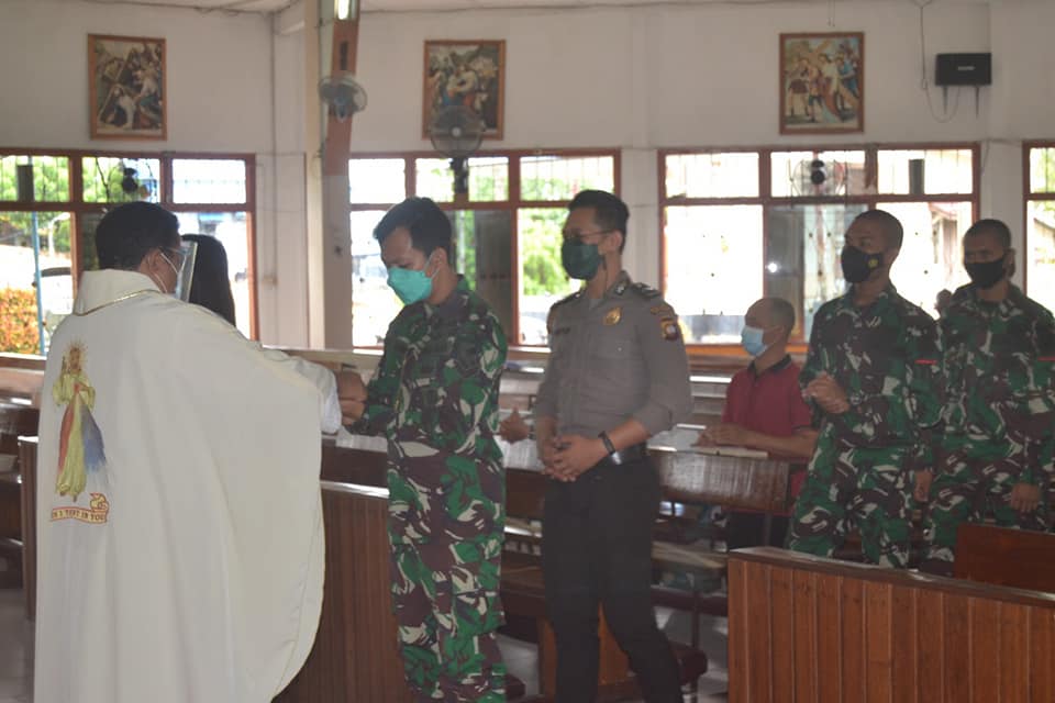 Dalam rangka menjaga sinergitas serta tali persaudaraan keluarga besar TNI di Sintang bersama dengan Polres Sintang melaksanakan Misa Jumat pertama di Gereja Maria Ratu Semesta Alam (Sei Durian) Kapuas Kanan Hulu Kecamatan Sintang, Kabupaten Sintang, Jum’at,3/9/21
