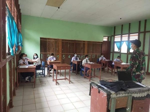 Selain menjadi Gadik Pratu Junius Ginting dan dua rekannya,sebelum kegiatan belajar mengajar di wajibkan mencuci tangan, memakai handsanitizer dan memakai masker.agar terhindar dari Penyebaran Covid-19″, ucapan nya.(Pen Yonif 144/JY).