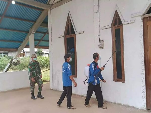 Sanggau – Babinsa Koramil 1204 – 10/ Balai Praka Budiman Subroto melaksanakan penyemprotan cairan disinfektan Di Fasilitas umum yg berada di Wilayah desa Empirang ujung.