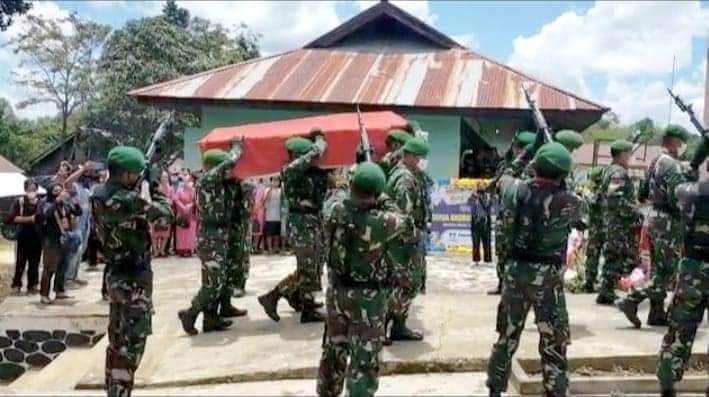 Merakai,-Anggota Satgas Pamtas RI-Malaysia Yonif 144/JY ikut serta menghadiri pemakaman jenazah Korban penyerangan kelompok separatis Papua di desa Merakai Kecamatan Ketungau Tengah, Kabupaten Sintang, Kalbar.