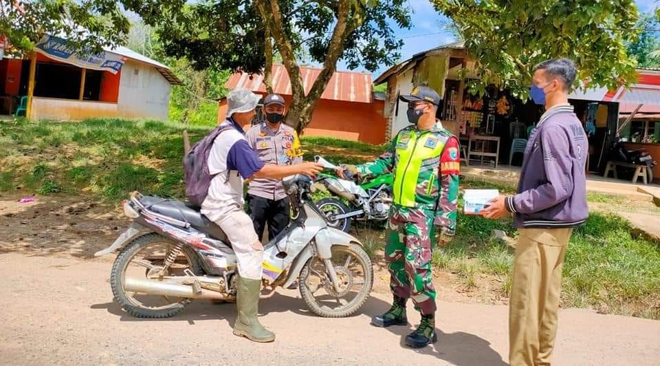 LANDAK – Babinsa Koramil 1201-11/Ngabang Koptu Wardiono bersama tim Satgas Covid-19 melaksanakan operasi yustisi penegakan protokol kesehatan di Desa Penyaho Dangku, Kecamatan Ngabang, 1Kabupaten Landak, Senin (6/9/2021).