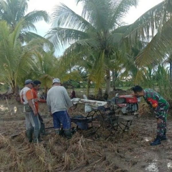 Dalam pelaksanaannya Babinsa Serda Supandi mendampingi pembajakan sawah pada Kelompok Tani (Poktan) dilahan milik Bapak Andi yang terletak di Desa Semelagi Besar, Kecamatan Selakau, Kabupaten Sambas, (12/9/21)