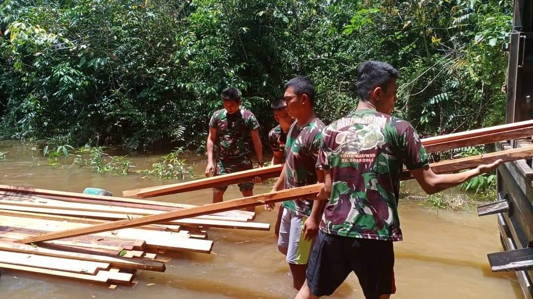 Ketapang – Luapan air sungai lantaran derasnya hujan dilokasi Pra-TMMD Ke-112, Kodim 1203/Ketapang mengakibatkan beberapa wilayah di Kec. Sungai Laur Kab. Ketapang terendam banjir termasuk sebagian Desa Bengaras yang merupakan disasaran fisik perehapan rumah tidak layak huni (RTLH), Sabtu (11/9/2021).