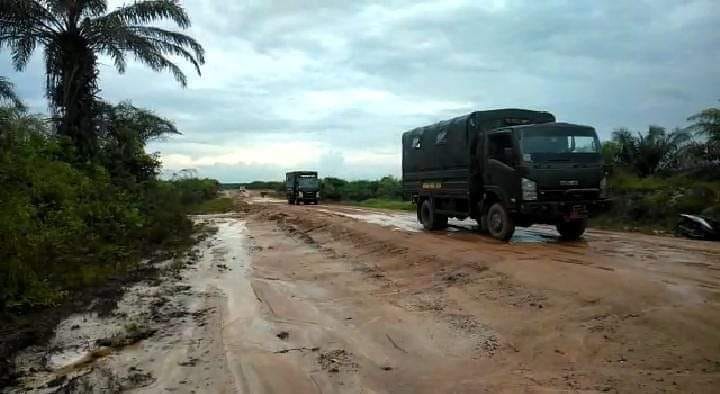 Ketapang – Sulitnya medan yang dilalui, baik jalan sempit maupun licin bukan menjadi halangan bagi para driver truk Kodim 1203/Ktp dalam mendorong material maupun personel ke sasaran Pra TMMD ke-112 Kodim 1203/Ktp yang berlokasi Desa Riam Bunut Kecamatan Sungai Laur, Kabupaten Ketapang. Minggu (12/9/2021)