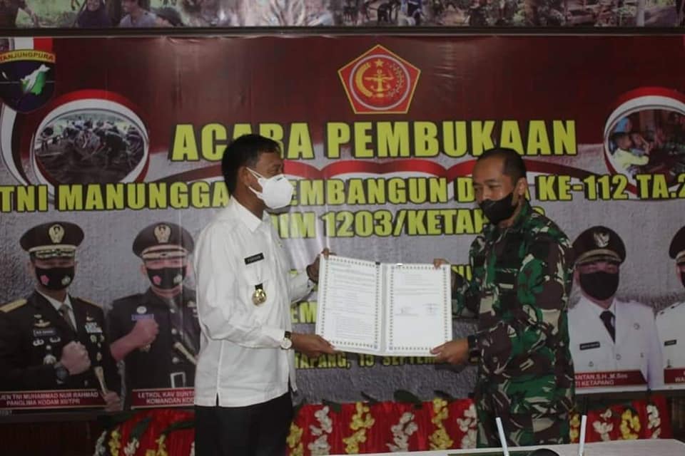 Acara Pembukaan TMMD Reguler Ke-112 TA. 2021, Kodim 1203/Ketapang tersebut dilanjutkan dengan penandatanganan naskah serah terima pekerjaan TMMD oleh Wakil Bupati Ketapang, H. Farhan SE., Msi, Kepada Dandim 1203/Ktp Letkol Kav Suntara Wisnu Budi Hidayanta SH.M.SC.,